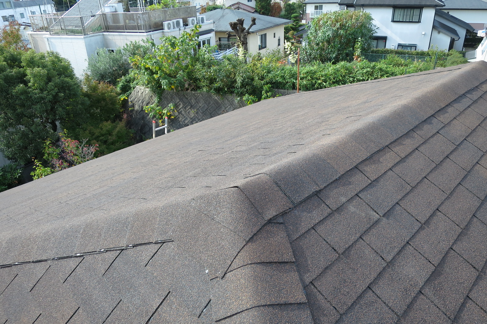 高槻の南平台の大きな一戸建て住宅の屋根葺き替えリフォームでした。屋根面積はなんと205m2もある家でした。古い家でしたが屋根の上は勾配が緩かったので屋根は足場無しでリフォームできました。もちろん壁はもちろん養生しました。屋根葺き替えですから既存の屋根を剥がし処分し、構造合板を貼り、防水シートしーとを2重にはり、その上にシングルアスファルトで仕上げました。幸いに雨がほとんど降らなかったのでたすかりました。屋根形状が少し複雑でしたが綺麗にできあがりました。