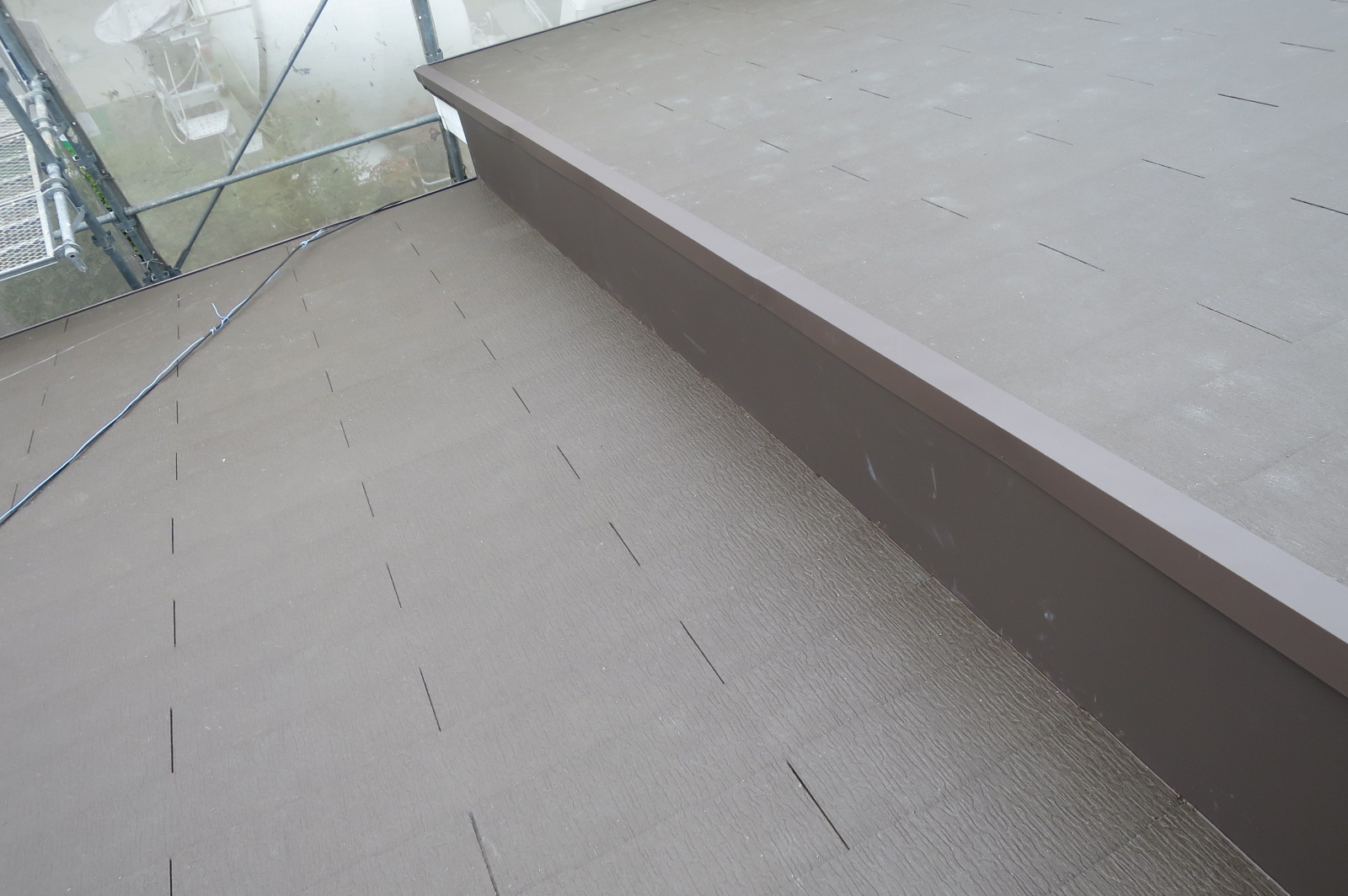 枚方菊丘の2軒続きのテラスハウスの屋根葺き替えでした。台風のために屋根や樋が破壊されていました。防水シートまで破れていたので 補修では修復不可能でした。そのため「屋根葺き替え」工事になりました。屋根の形状から この現場は「カラーベスト」の一種で「アスファルトシングル葺き」になりました。「屋根葺き替え」の工程を簡単に説明するとまず既存の屋根のカラーベストやシートを撤去します。そして構造合板で屋根を張り直しします。次に「ルーフィング(防水シート)」を張ります。最後に屋根表面になる「アスファルトシングル葺き」を施工して仕上げます。もちろん「板金屋根工事」も専門の職人さんに制作してもらい、取り付けます。破損した問いも新しく制作しセットしました。